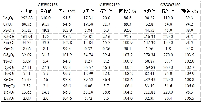 參考《GB/T 40798 離子型稀土原礦化學分析方法 稀土總量的測定 電感耦合等離子體質(zhì)譜法》,采用氫氟酸、硝酸、高氯酸進行濕法消解。利用碰撞反應(yīng)模式控制氧化物產(chǎn)率,降低輕稀土氧化物/氫氧化物對其他稀土元素的干擾;并根據(jù)實際樣品中元素含量,校準稀土氧化物/氫氧化物的干擾。對三個稀土礦標準物質(zhì)中14種稀土元素(以氧化物形式表示)進行測試,各元素回收率為86.6 %~109.9%。
