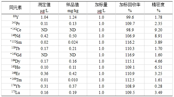 參考《GB/T 18115.1-2020 稀土金屬及其氧化物中稀土雜質(zhì)化學分析方法 第1部分:鑭中鈰、鐠、釹、釤、銪、釓、鋱、鏑、鈥、餌、銩、鐿、镥和釔量的測定》,將高純氧化鑭用稀硝酸溶解,利用內(nèi)標法進行校正。考察加標回收率及精密度。方法加標回收率為98.9%~116.9%,精密度為0.28%~9.20%。