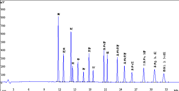 16種多環芳香烴標準品液相色譜圖如下: