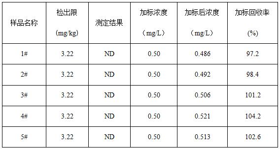 取5種不同顏色的涂層試樣,各稱取0.2g(精確至0.0001g),采用氧彈燃燒后冷卻定容,經0.22μm的水系濾膜過濾后上機得到樣品譜圖,如下圖3所示,5種涂層試樣的測定結果均低于方法檢出限,同時對5種試樣進行了加標處理,加標回收率在97.2%~104.2%之間。測試數據詳見表2。