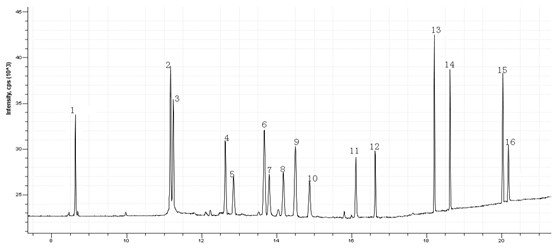 圖1. 16種有機(jī)磷標(biāo)準(zhǔn)溶液TIC圖