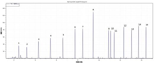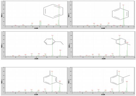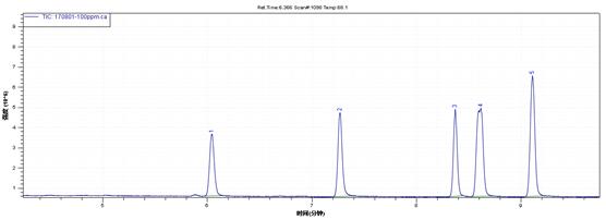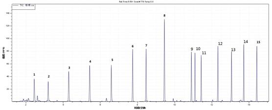 1.正己烷 2. 3.三氯乙烯 4.甲苯 5.辛烯 6.乙酸丁酯 7.乙苯 8.對(間)二甲苯 9.鄰二甲苯 10.苯乙烯 11.壬烷 12.異辛醇 13.十一烷 14.十四烷 15.十六烷