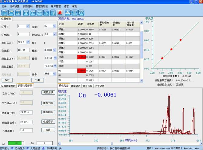 樣品測試:于原子吸收光譜儀波長324.8nm處,使用空氣-乙炔火焰,以水調(diào)零,測量試液的吸光度,減去隨同試料的空白試驗溶液的吸光度,從工作曲線上查出相應的銅濃度。